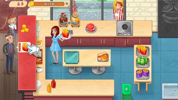 烹饪日记是一款有趣的模拟经营类游戏,他画风采用了经典的美式画风,为玩家呈现了一个精致的餐厅,在游戏中,玩家为了帮助外公拯救餐厅来到了这里帮助打理餐厅。烹饪日记玩法简单,玩家只需要按照客人的要求,在他们的耐心时间内烹饪好需要的餐品就能额外获得好评,赚取更多的金币。赚取的金币可以用来升级餐厅设施,购买装饰,家具等等,用不同风格的家具,将餐厅装饰成自己喜欢的样子,还会额外的吸引客人光临。
